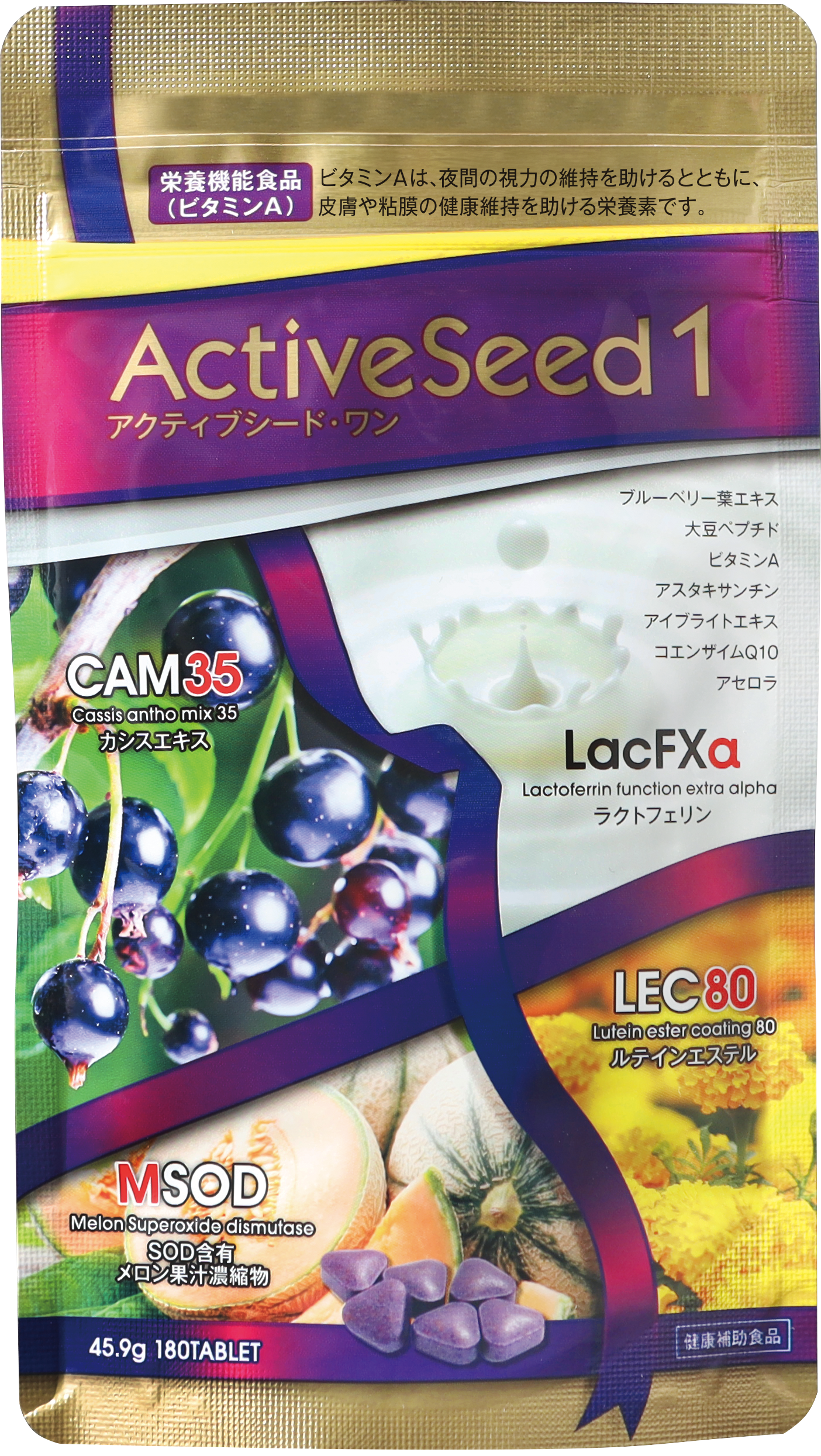 たとえば、「アクティブシード・ワン」というサプリメントには、3つのオリジナル原料であるラクトフェリンの「LacFXα」、カシスエキスの「CAM35」、ルテインエステルの「LEC80」に加えて、サポート原料としてSOD酵素を含有する「メロン果汁濃縮物」「ブルーベリー葉エキス」「大豆ペプチド」などがバランスよく配合されています。人々の毎日の健康維持に役立つサプリメントです。